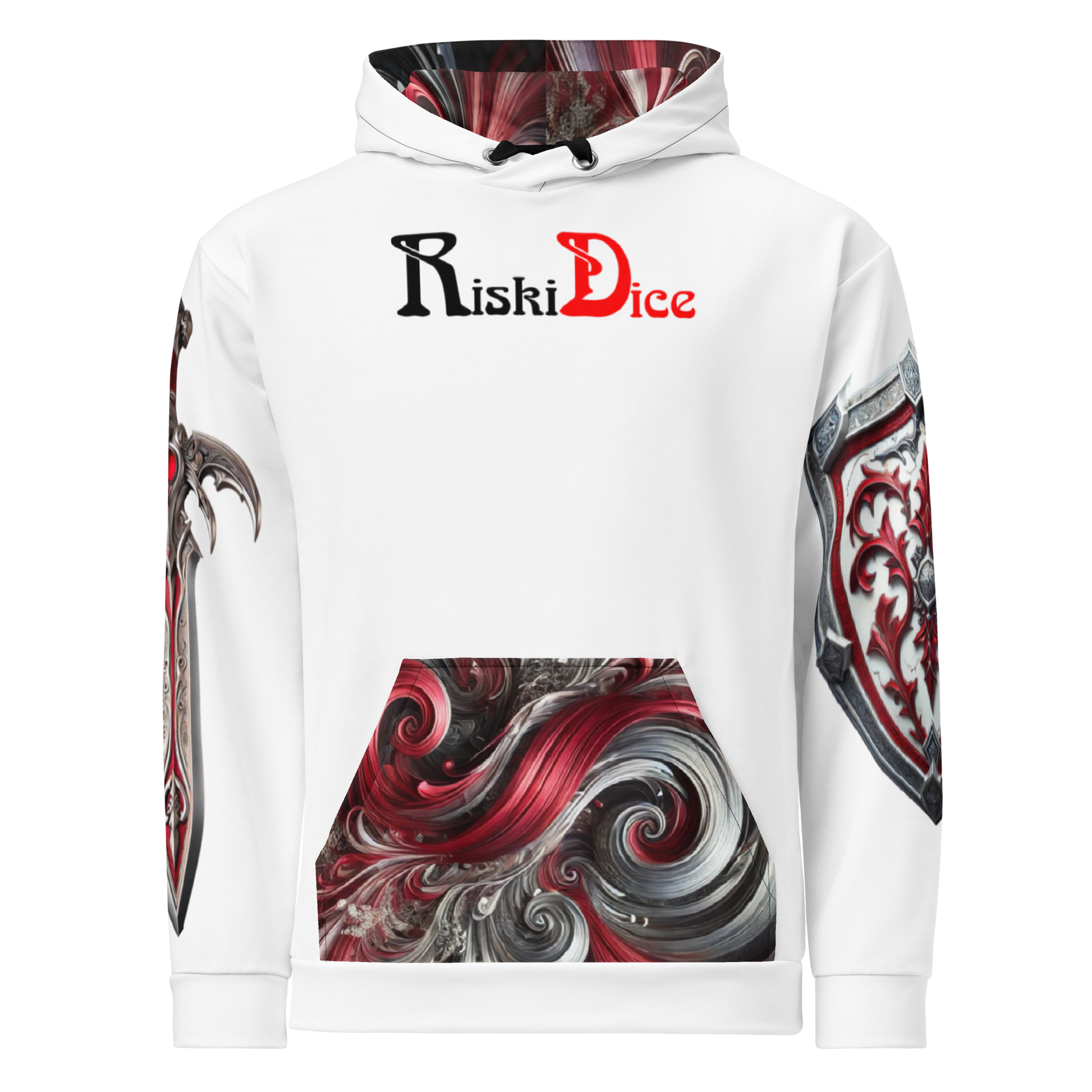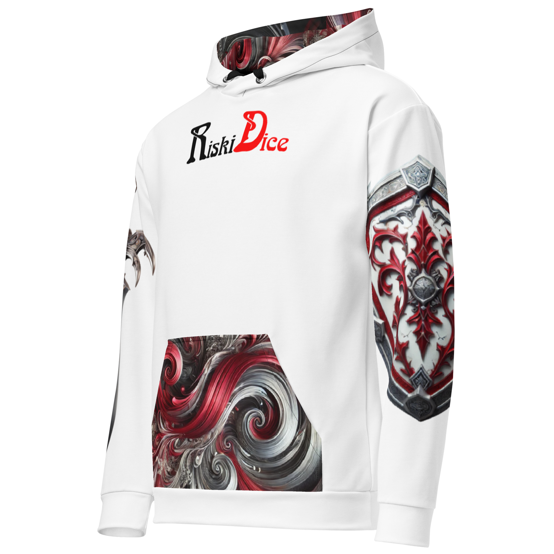 A guardian’s mantle woven into wearable art—this hoodie exudes strength through white and red hues bound by silver detailing. A testament to unwavering protection, its design echoes the defiance of a shield that never falters.