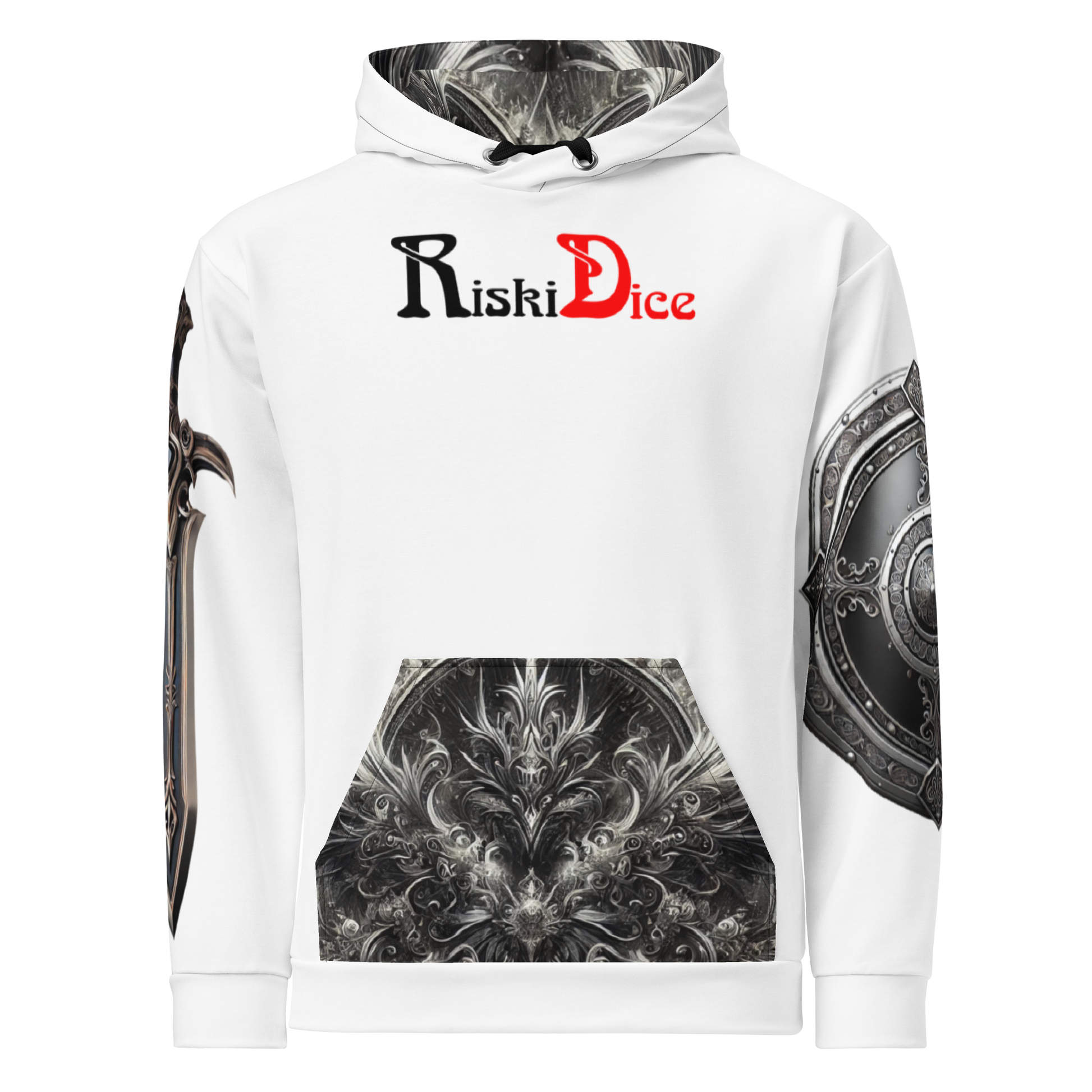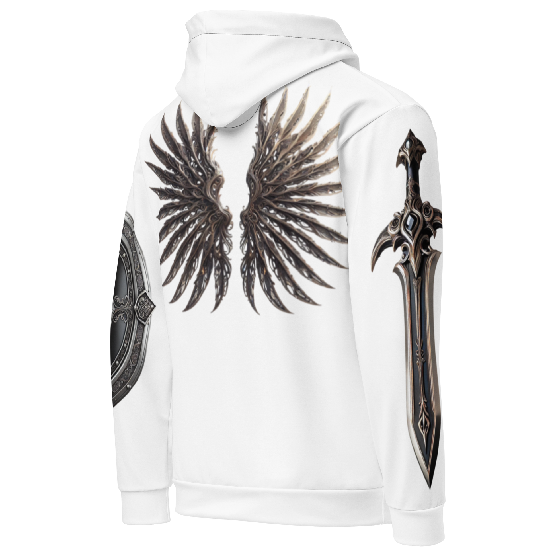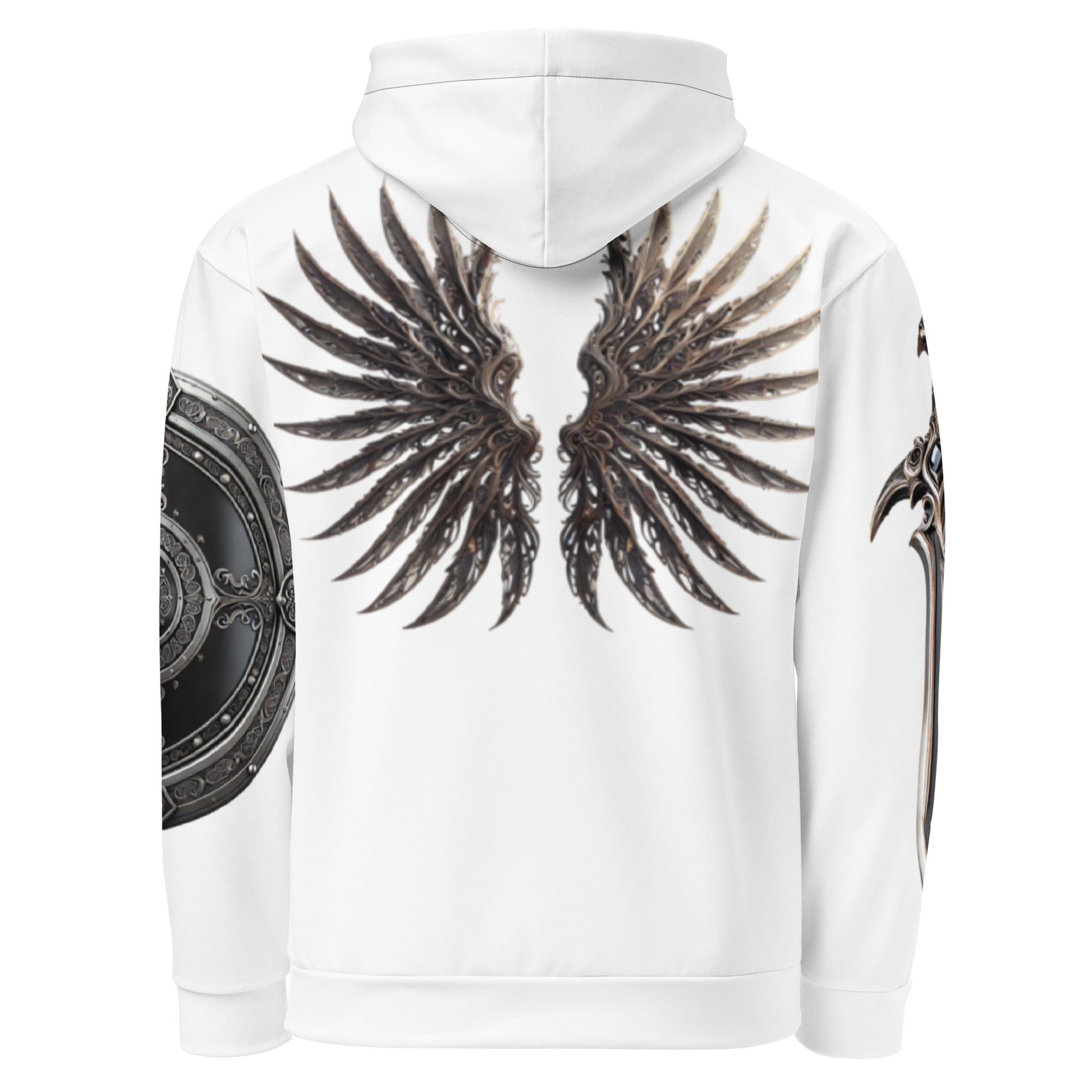 Dark royalty reigns supreme in this hoodie, where deep black melds seamlessly with silver filigree, representing power tempered by wisdom. The design resonates with a ruler born from the twilight, commanding both respect and awe.