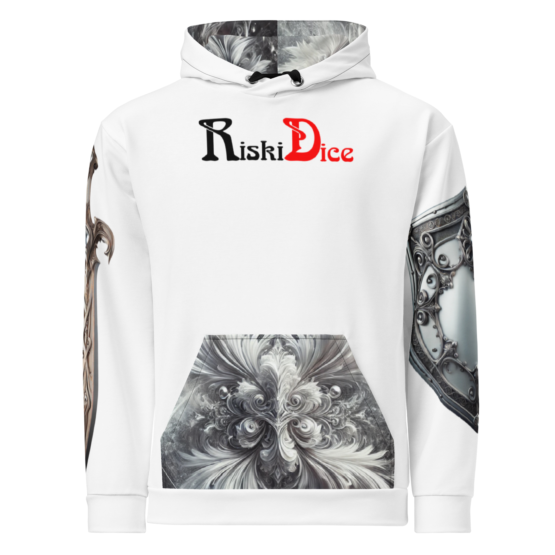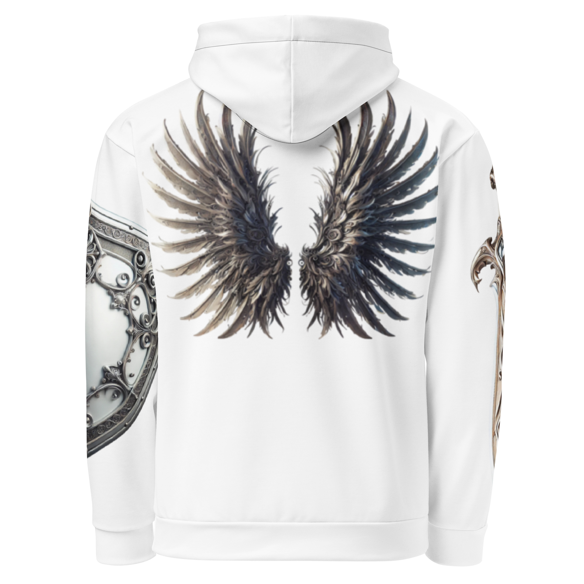 A symbol of divine guardianship, this hoodie blends pristine white with shimmering silver, embodying the unwavering strength of a celestial warrior. Accents of radiant blue streak through the design, mirroring the sacred energy of an eternal protector. With a regal yet battle-hardened presence, it stands as a testament to valor, duty, and the pursuit of justice beyond the mortal realm.